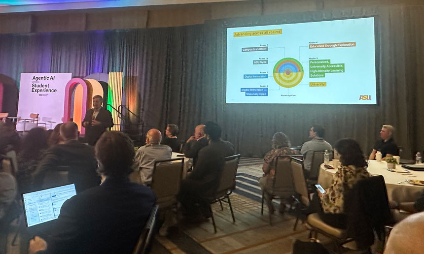 As one of the nation’s top schools in innovation, Crow called on leaders to explore how agentic AI can help dismantle traditional barriers to education and expand access at scale.