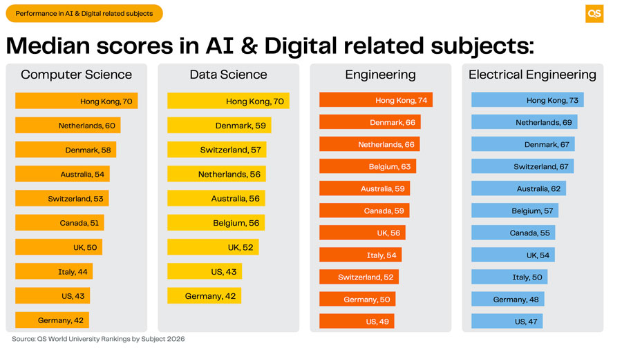 In the ranking, data science & AI is now a standalone ranked subject — for the first time, QS treats it as a full discipline, not a subcategory of CS. This is significant because universities investing in AI programs now receive direct rewards in rankings.