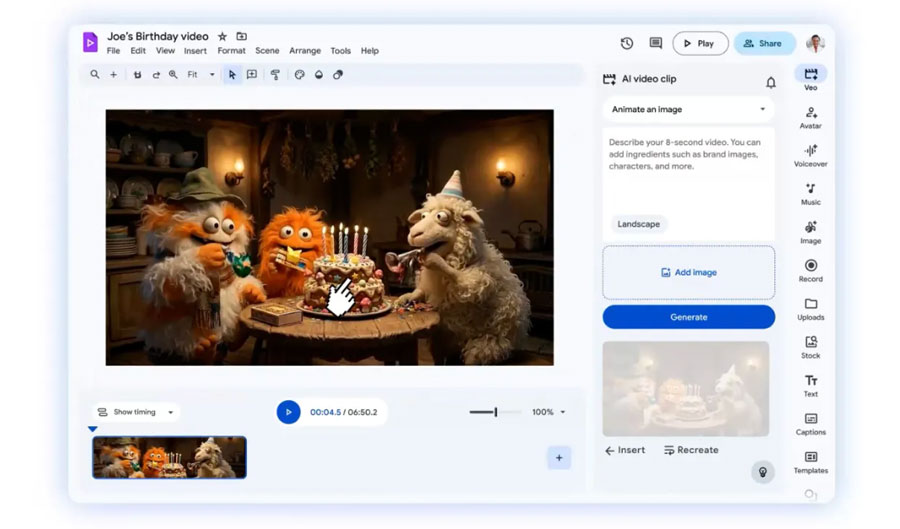 Vids supports adding the Veo 3.1 video-generation model, which can create eight-second clips within the video editing tool. It also supports Lyria 3 and Lyria 3 Pro for adding music and sound effects to clips.
